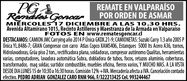 REMATE POR ORDEN DE ASMAR EN VALPARAISO MIERCOLES 17 DESDE LAS 10.30 HRS EN AV ALTAMIRANO 1015 RECINTO ASMAR EN VALPARAISO DESTACAMOS VERHICULOS , COMPRESOS GRAN TAMAÑO, ESTANQUES DE 5000 LTS , TORNOS, HERRAM,IENTAS, MUEBLES DE OFICINA, ETC