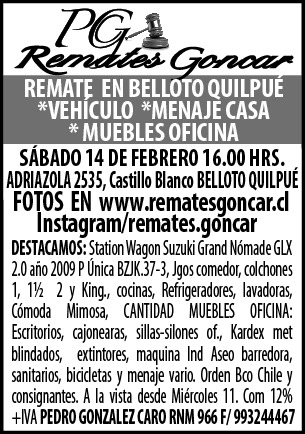 REMATE VEHICULO STATION WAGON MARCA SUZUKI GRAN NOMADE GLX 2.0 AÑO 2009 OPERATIVO *** FINO MENAJE DE CASA ** MUEBLES OFICINA SABADO 14 DE FEBRERO A LAS 16 HRS EN CALLE ADRIAZOLA 2535 CASTILLO BLANCO SECTOR BELLOTO EN QUILPUE ( AVISO Y FOTOS DESDE DOMINGO 8 DE FEBRERO )