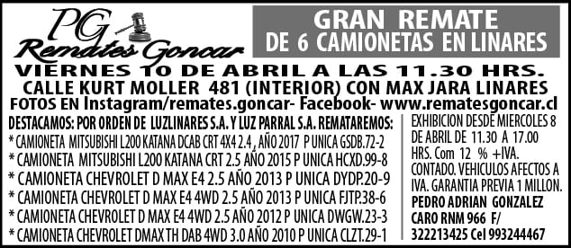 GRAN REMATE DE CAMIONETAS EN LINARES VIERNES 10 DE ABRIL A LAS 11.30 HRS EN KURT MOLLER 481 ( INTERIOR) CON MAX JARA POR ORDEN DE ELECTRICAS LUZLINARES Y LUZPARRAL REMATAREMOS 6 CAMIONETAS DIESEL ( 2 MITSUBISHI KATANA L200 AÑOS 2015 Y 2017 Y 4 CHEVROLET D MAX 2010 A 2013 ) EXHIBICION DESDE MIERCOLES 8 DE ABRIL FOTOS Y AVISO PROXIMAMENTE